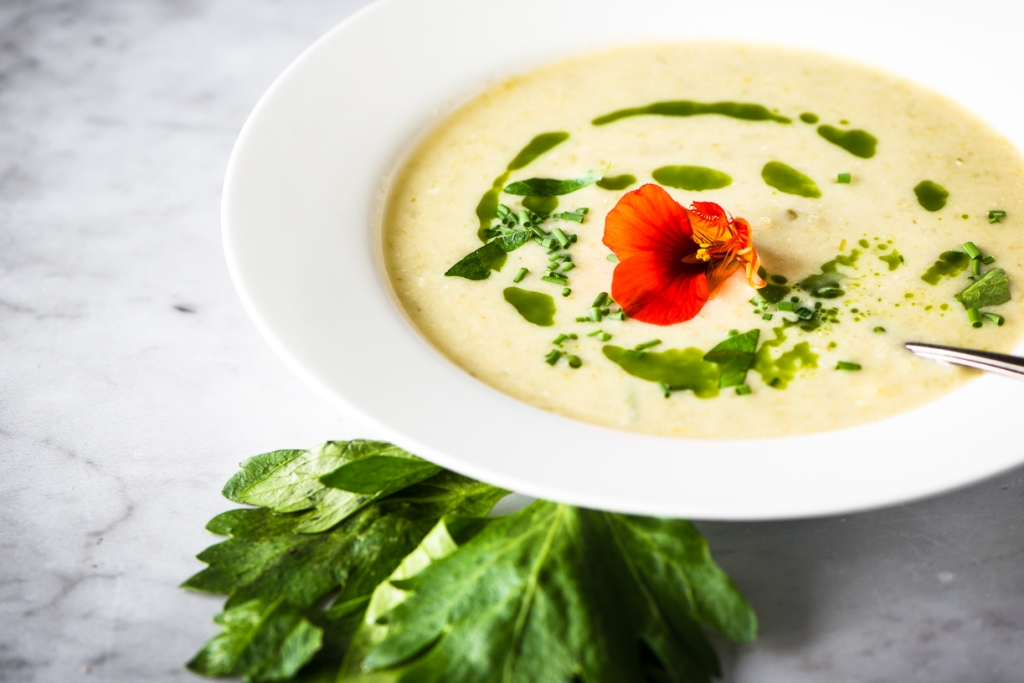A lot of love and care goes into growing each one of those tasty veggies here on the farm. There is truly nothing you can buy at the store that compares with garden fresh celery that is in season though. Like a vine ripen tomato, locally grown celery right from the garden is quite unlike anything you’ve had before. We are certainly proud to grow this item and send it home to our CSA member tables throughout the summer. And this soup recipe– with the Celery Leaf + Herb oil drizzled over top– just takes the produce to a whole new level again!