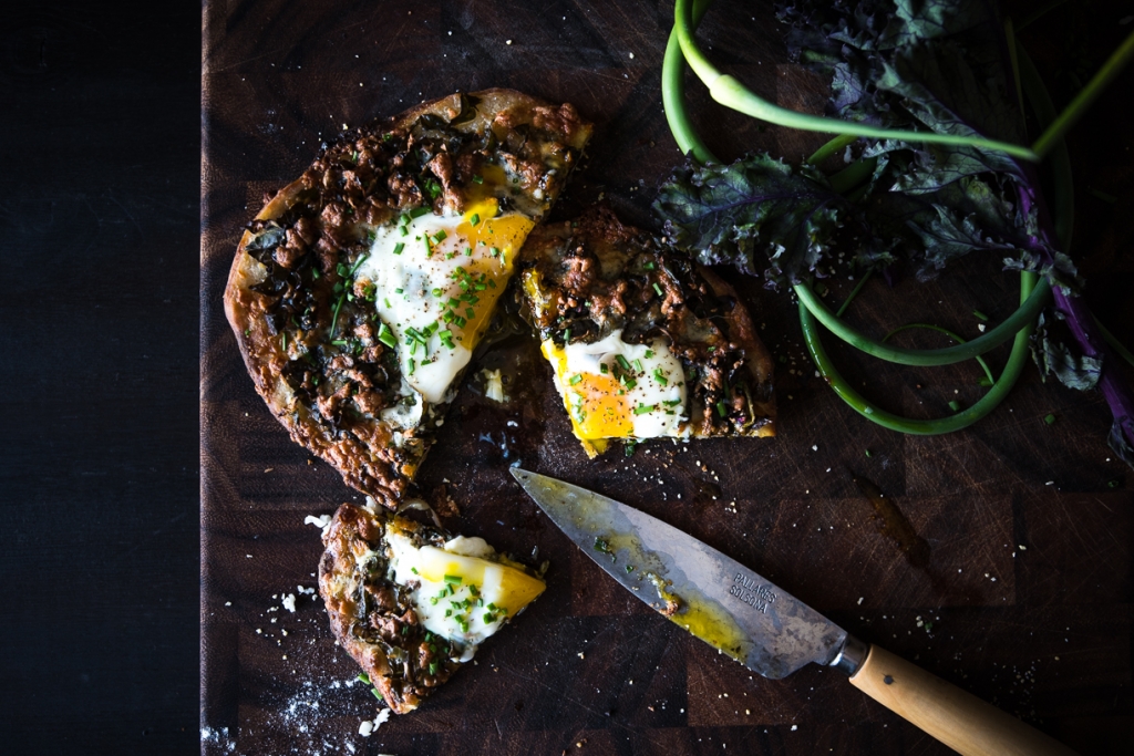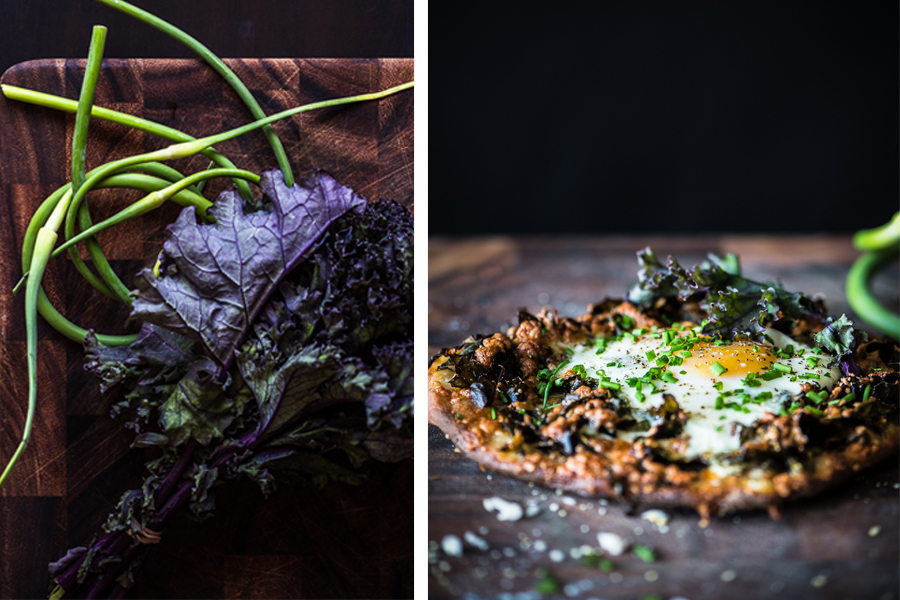 I don’t know if I can think of a more satisfying breakfast this morning as I look at upon this delicious pizza. It’s just so darn appetizing. Topped with kale, chard, garlic scapes (or alternatively one of our green onions), along with those farm fresh eggs so many of our members are receiving from Herbert Family Farm… For real, how can this not be calling to your tastebuds this very minute!