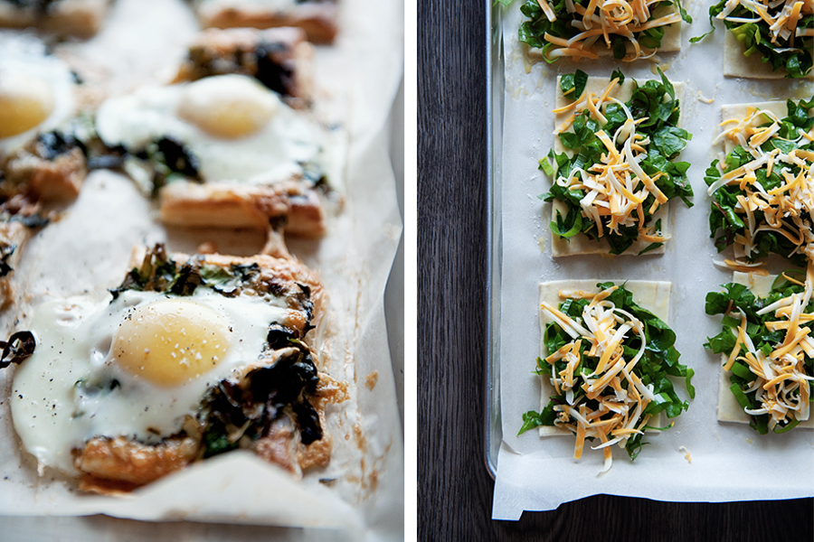 - Top each pastry square with a generous handful of swiss chard mixture and grated cheese. Place baking sheet in oven (along with potatoes if you have convection, otherwise, do this after potatoes are finished so everything cooks evenly). Bake for 15 minutes, or until edges are beginning to puff and colour is beginning to darken.