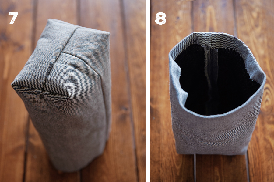 - Fold your 5″ length of ribbon in half and pin it in, matching both sides together. Pin together the entire way across the top. Sew across. (This may takes a little finesse, as the bag is heavy and full at this point, but it is doable).