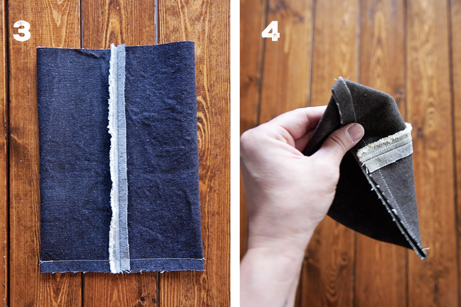 - Fold fabric in half. Sew together down the side (1cm seam allowance).