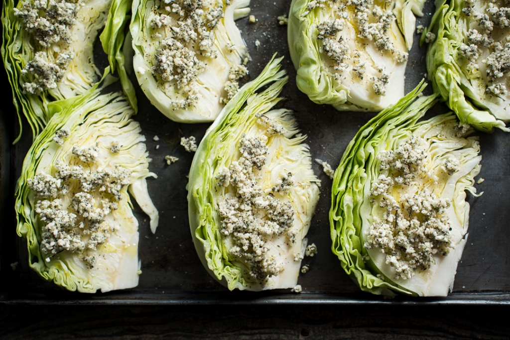 - Quarter the cabbage head lengthwise then cut in 2 or 3 additional slices per each quarter depending on the size of your cabbage. Arrange the cabbage wedges on the prepared baking sheet. Brush with olive oil, then sprinkle generously with the parmesan mixture.