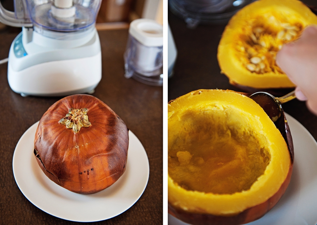 6. Scoop out remaining flesh into a bowl (or directly into a food processor or blender). Puree until smooth.