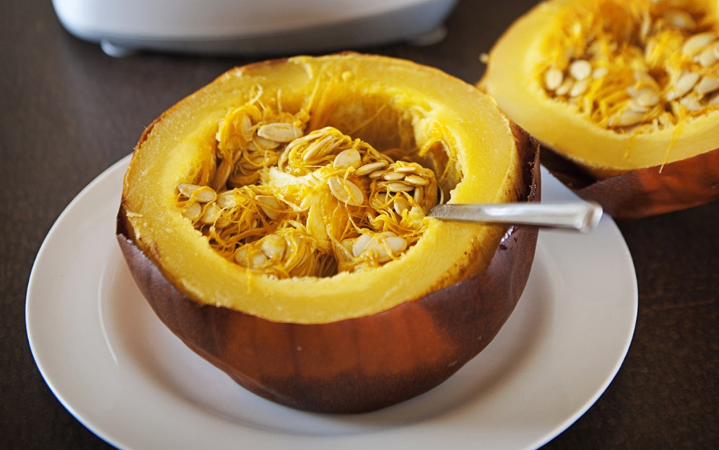 - Knock off stem of squash or pumpkin against the edge of counter and discard. Stab with fork in several places to allow for steam to escape. Place in oven whole.