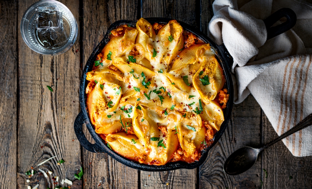 - Preheat the oven to 400 F. Add tomato sauce, milk, oregano to skillet. Season with salt and pepper to taste. Add stuffed pasta to skillet in an even layer and top with mini bocconcini and red pepper flakes.