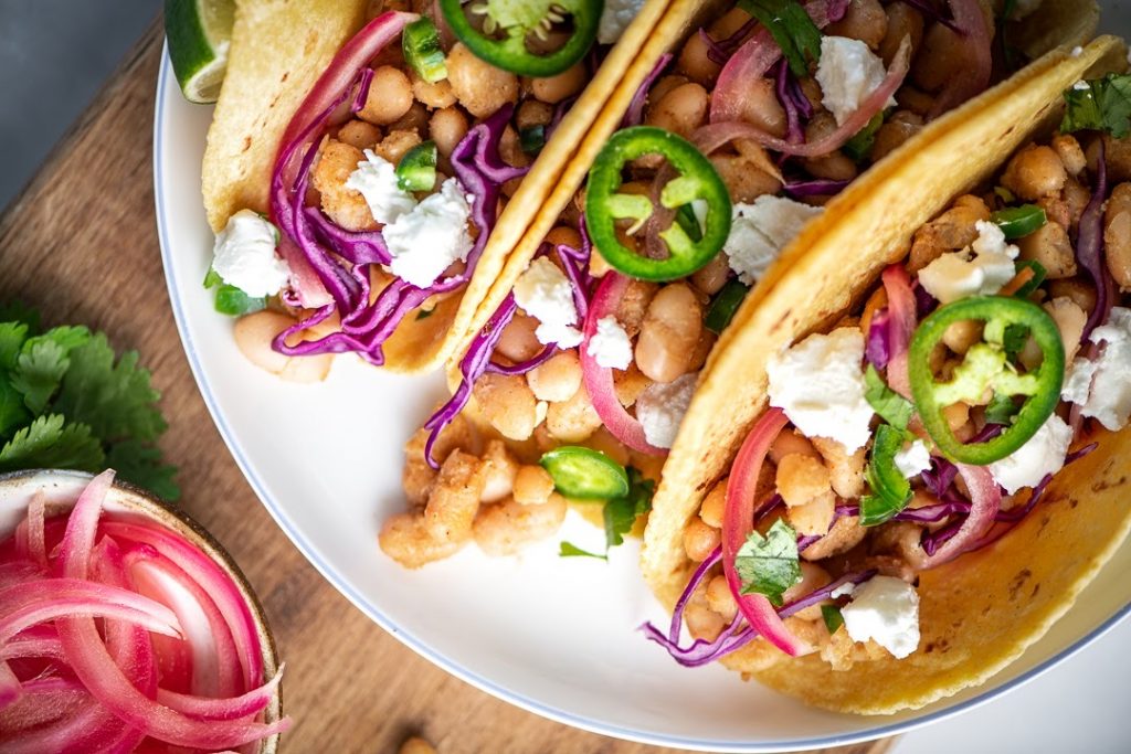 White Bean Tacos with Pickled Onion + Goat Cheese