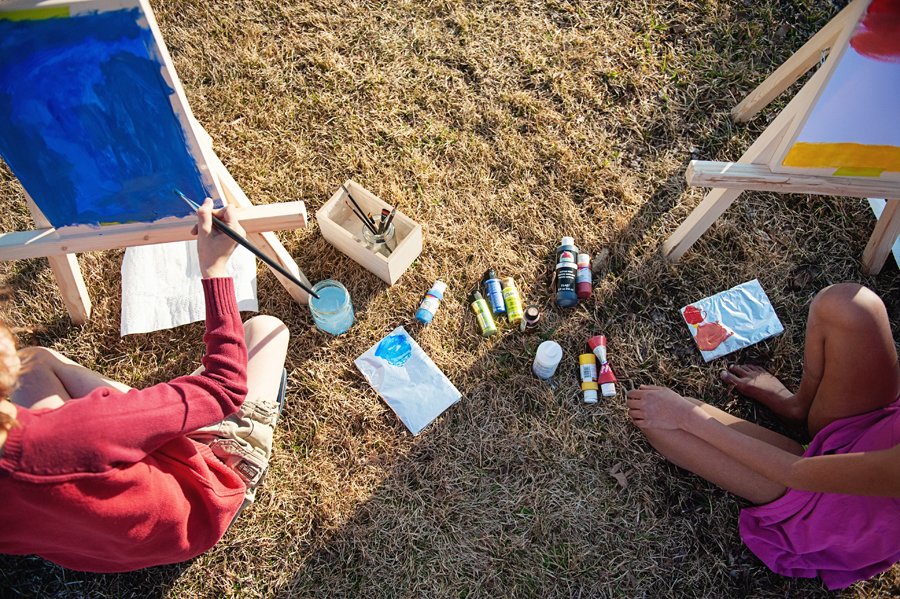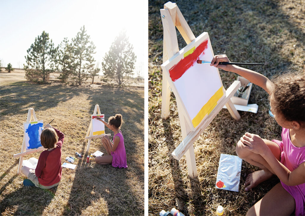 Ever since I took up painting again (after a long decade away raising farm and kids), the kids have been asking to do it too. This momma won’t let them paint with any hardcore paints in the house— but outside, that’s a whole different story. These easels were the solution to that (along with the pure joy I feel at seeing them create while surrounded by nature *happy sigh*). Adding some inexpensive craft acrylics and a few dollar store supplies has made it an awesome little endeavour that they have been doing almost daily ever since!