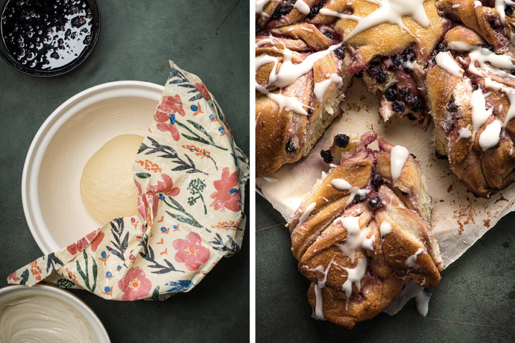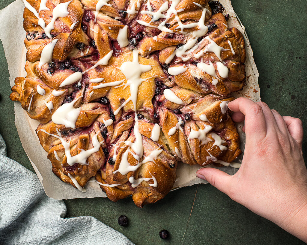 Just pull yourself off a piece of this filled prairie berry bread and bite a delicious mouthful. Mmmm. Beautifully shaped and amply filled, this bread has all the right elements to be made in (or out) of berry season. You can make it using fresh or frozen berries, or substitute with prepared jam, and the cream cheese filling adds a richness to accentuate those wonderful berry flavours.