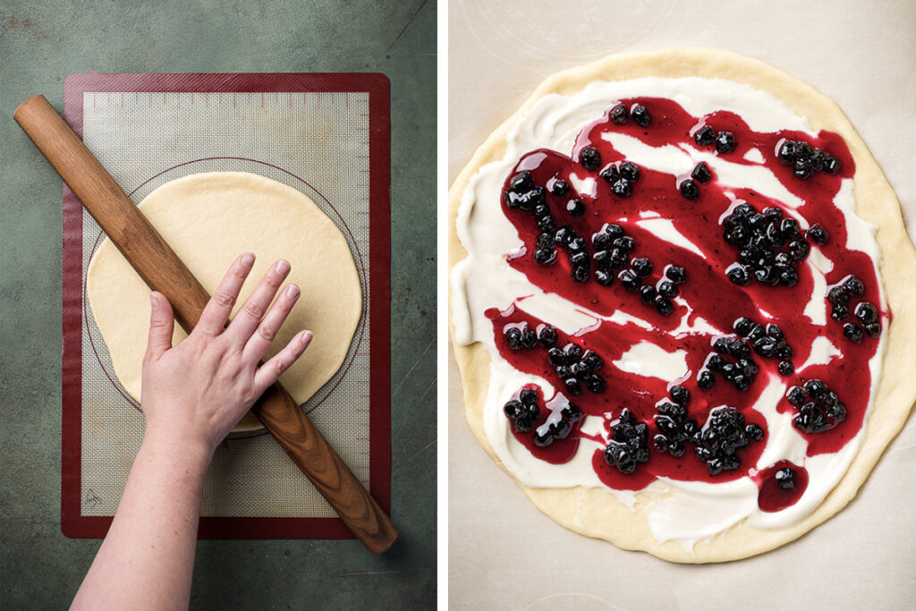 - Roll one ball a time into a 10-inch circle. Place dough on parchment paper lined pizza pan or large baking sheet. Spread a thin layer of cream cheese filling, followed by saskatoon filling on the dough, leaving half-an-inch space from the edge. Roll out a second ball, layer onto of the first and layer with more cream cheese and saskatoon filling. Roll out third ball, layer again. Roll out fourth ball and place on top leaving the top dough bare.