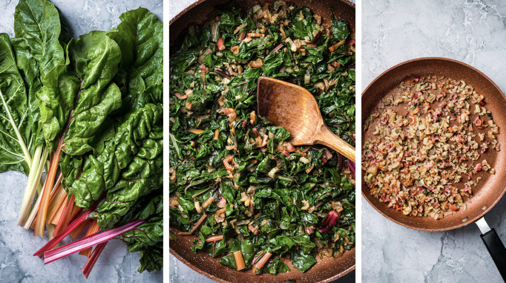 - In a large sauce pan, heat olive oil. Add shallot and garlic and sauté for 2 minutes. Add thinly sliced stems and cook for another 5 minutes. Add greens and cook until wilted (3-5 minutes). You can add a splash of water to help the process. Season with salt and pepper. Let cool.