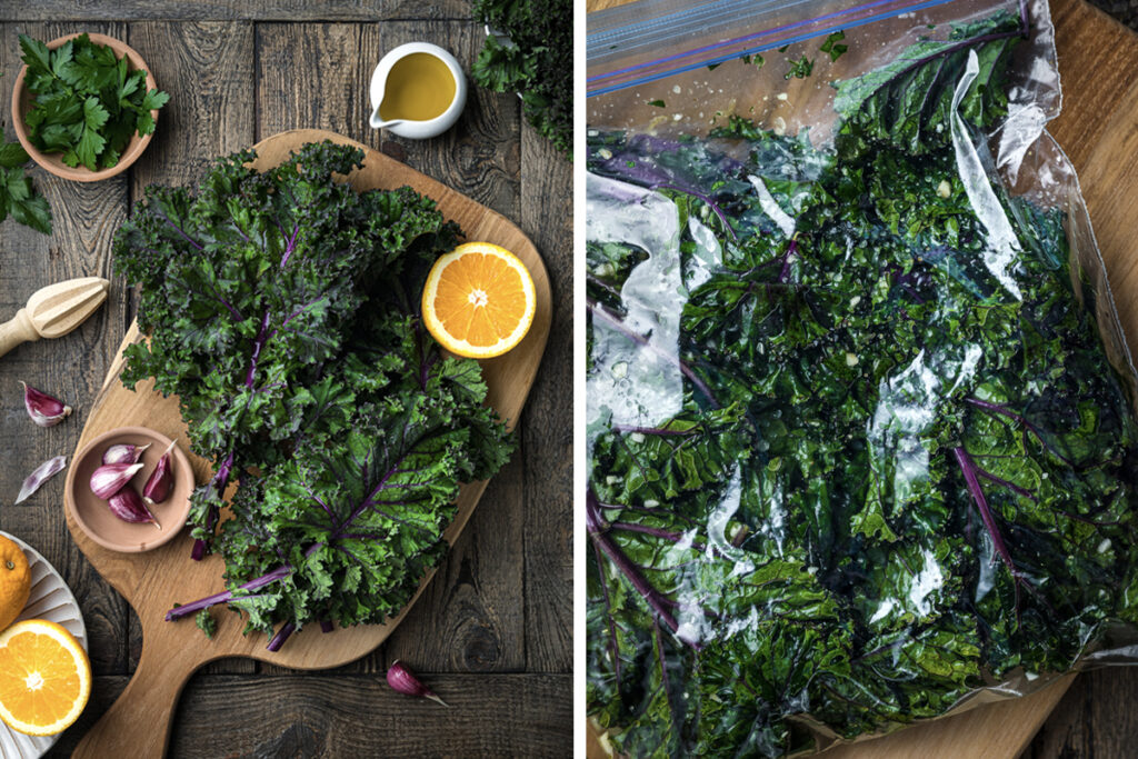 - In large resealable bag, combine all ingredients. Massage kale until evenly coated.