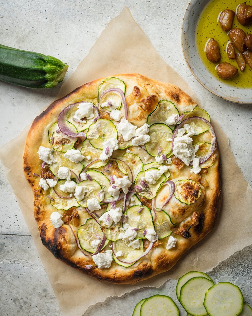 Zucchini Pizza with Garlic Confit + Goat Cheese