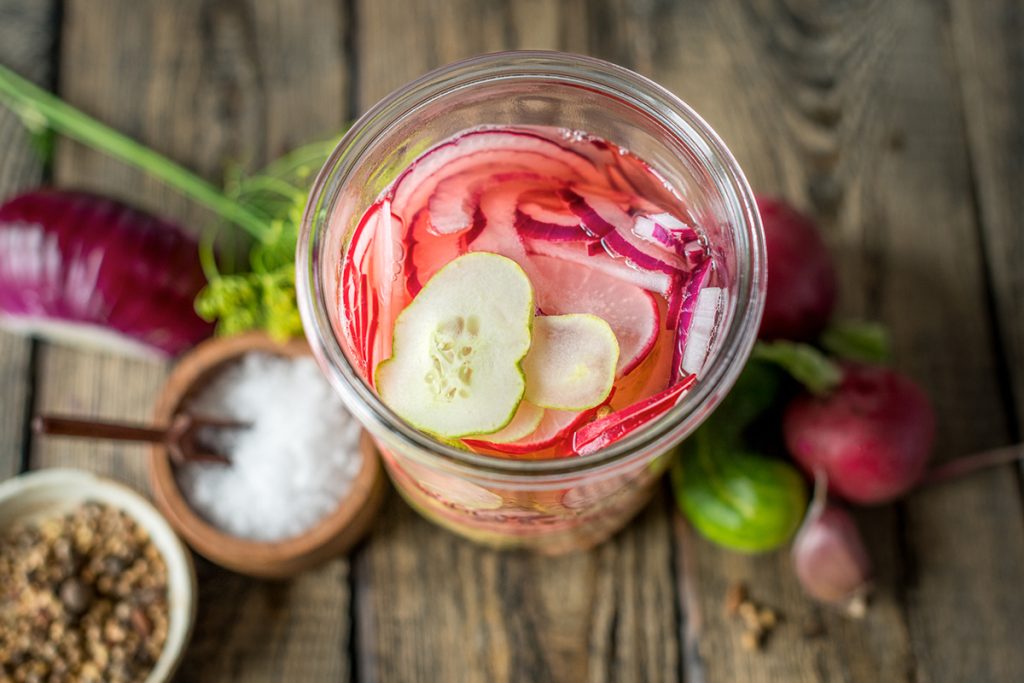 - 1 1/2 cups sliced vegetables (such as onions, garlic scapes, cucumber, radishes, carrots, cauliflower, beans, beets, and jalepenos)