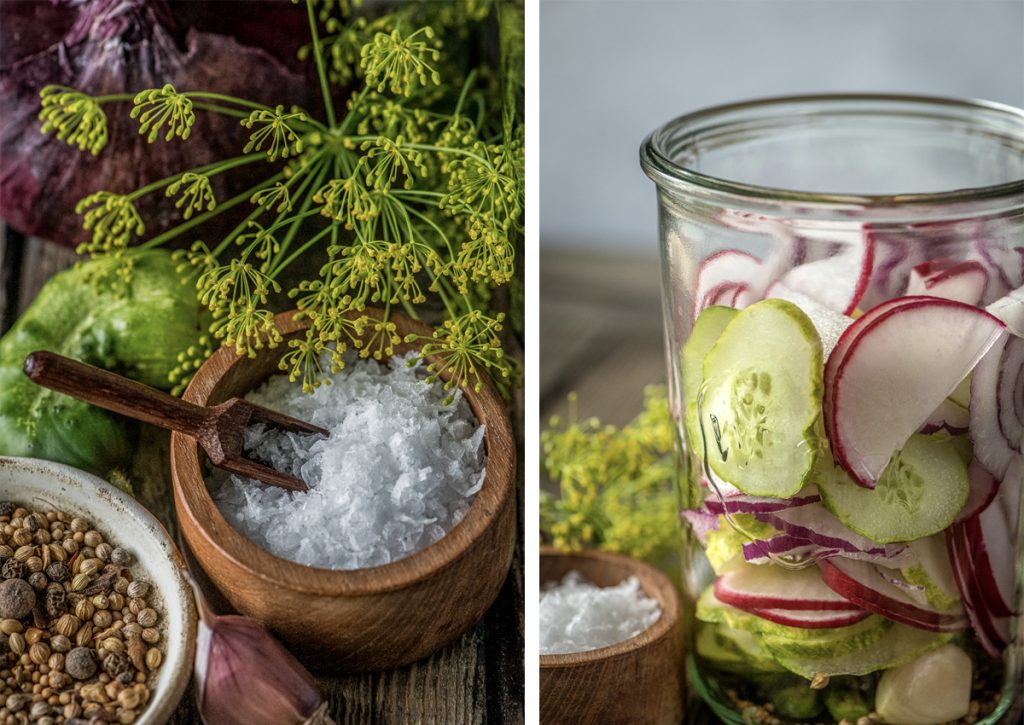 - 1 1/2 tsp aromatics and spices (This is where you can start to experiment with what you like, or buy a premade mix from the store. Think fresh dill or dill seeds, mustard seeds, coriander seeds, peppercorns, whole cloves, allspice and chilli flakes. I like to use a mix of dill, coriander seeds, mustard seeds and a few peppercorns.)