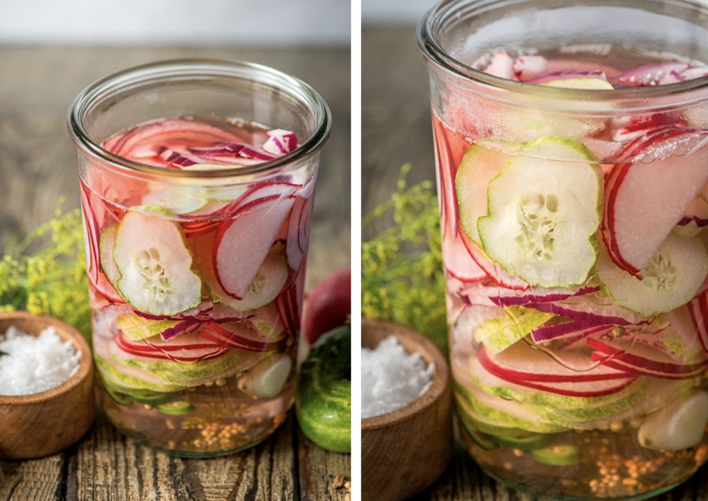 What I love about this recipe is that you can really use most any vegetable you enjoy. Our personal favourites are cucumbers, radishes and red onions. Red onions also give that gorgeous pink hue to the pickle jar. Have fun experimenting with the aromatics and spices as well! Enjoy eating them on your tacos, salads, sandwiches, sides, or as a tasty refrigerator snack– yes please!