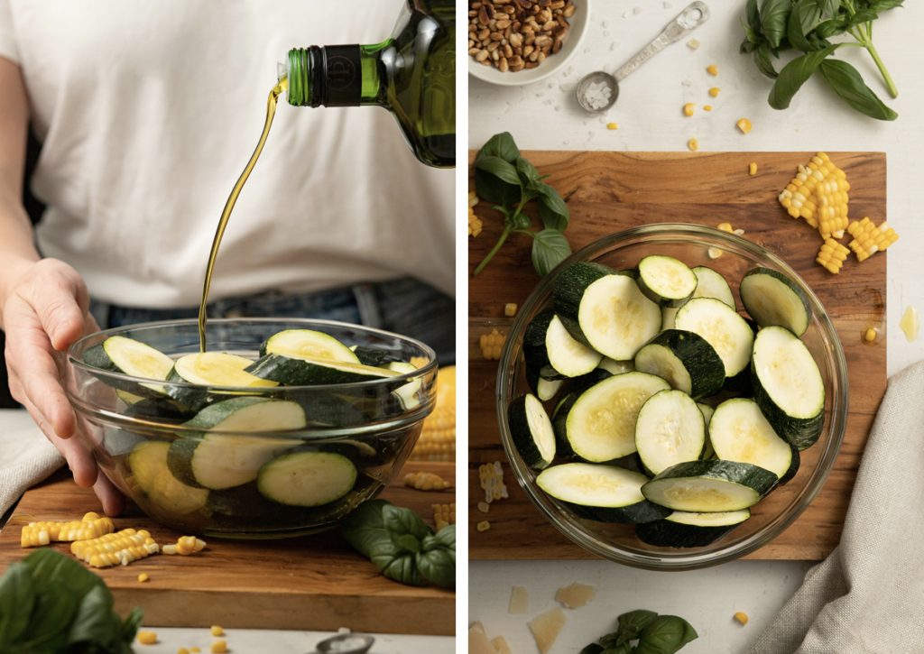- Heat grill to medium-high heat. Toss the zucchini in a bowl with olive oil. When the grill hot, lay out the zucchini and grill on each side for 2 minutes, until slightly charred on each side. Remove from the grill to a large platter and set aside.