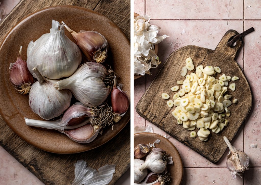 - Layer sliced garlic on parchment lined baking sheet. Heat oven as low as yours will allow (do not exceed 140°F), low and slow is the key to avoiding cooking or baking the garlic. You can leave the oven door slightly open (insert a wooden spoon to hold door open a crack) with the fan on, or use convection setting to circulate the air. Dehydrate for 2-4 hours until garlic is crisp and dry and snaps easily.