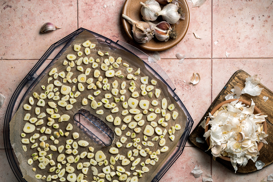- Layer sliced garlic on dehydrator trays. Heat at 105°F and dehydrate for 12-18 hours or until the garlic is completely dry and snaps easily. Low and slow is the key to avoiding cooking or baking the garlic.