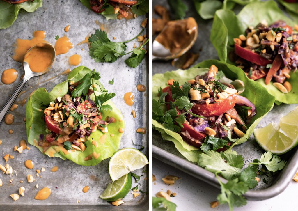 - To serve, fill butterleaf lettuce leaves with a large spoonful of the mushroom mixture and sprinkle with peanuts. Dip in remaining peanut sauce, if desired.