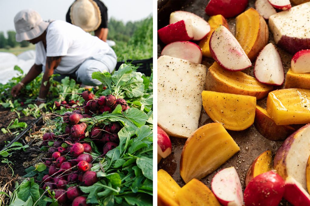 - Quarter the beets lengthwise. Cut the turnip so that it’s a similar size to the beets. Add the beets, turnips and radishes to one large baking sheet or two smaller ones. Drizzle with olive oil and season with salt and pepper. Toss to coat and distribute the veggies into a single layer on the baking sheet(s).