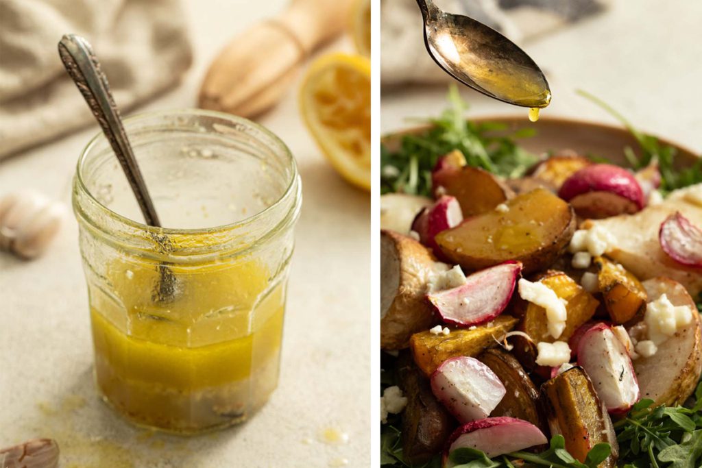 - While you allow the veggies to cool, whisk the vinegar, lemon juice and zest, mustard, garlic and honey in a large measuring cup or a small bowl. Slowly pour in the olive oil, whisking the entire time. Season with salt and pepper.