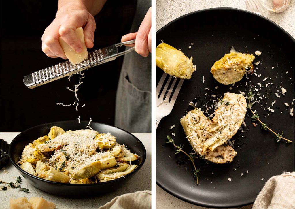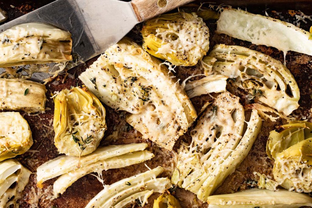 - Roast for 25-30 minutes before sprinkling each slice with parmesan cheese. Continue to roast for another 10 minutes, until the fennel and artichokes are tender and caramelized. Serve immediately.
