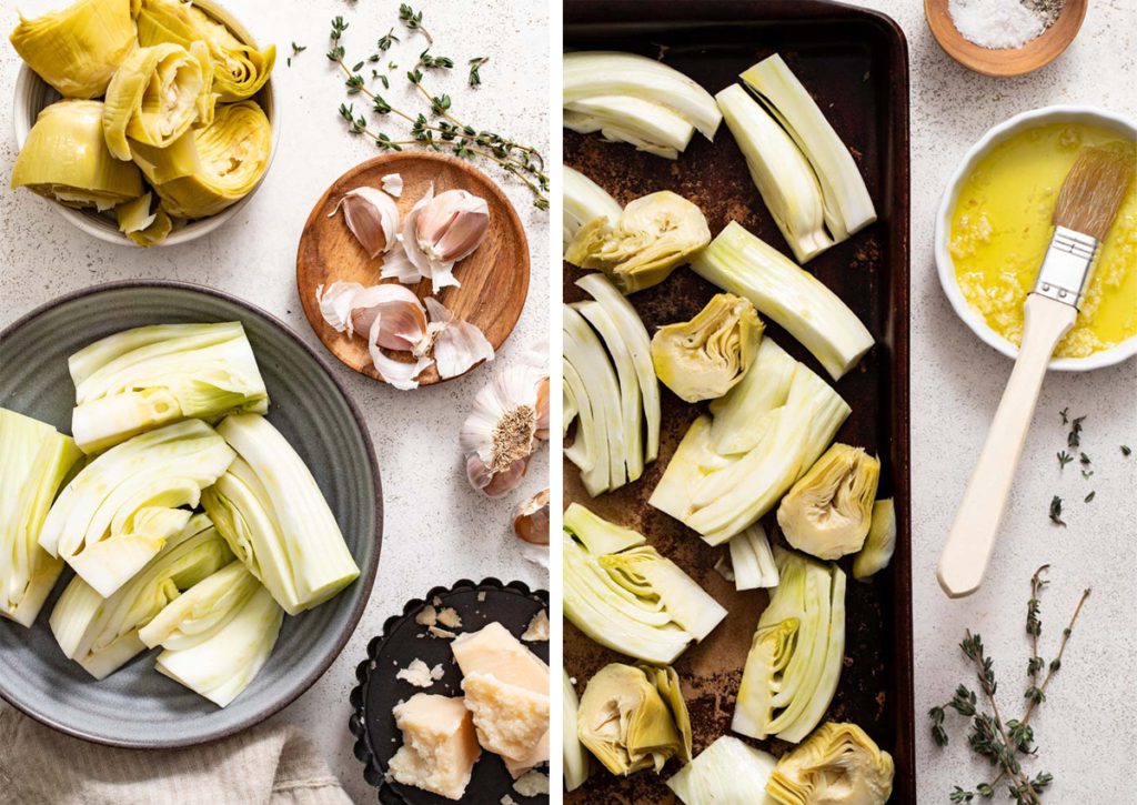 - Drain the artichoke hearts, slice in half lengthwise and pat dry. Arrange on the baking sheet along with the fennel, making sure that nothing overlaps.