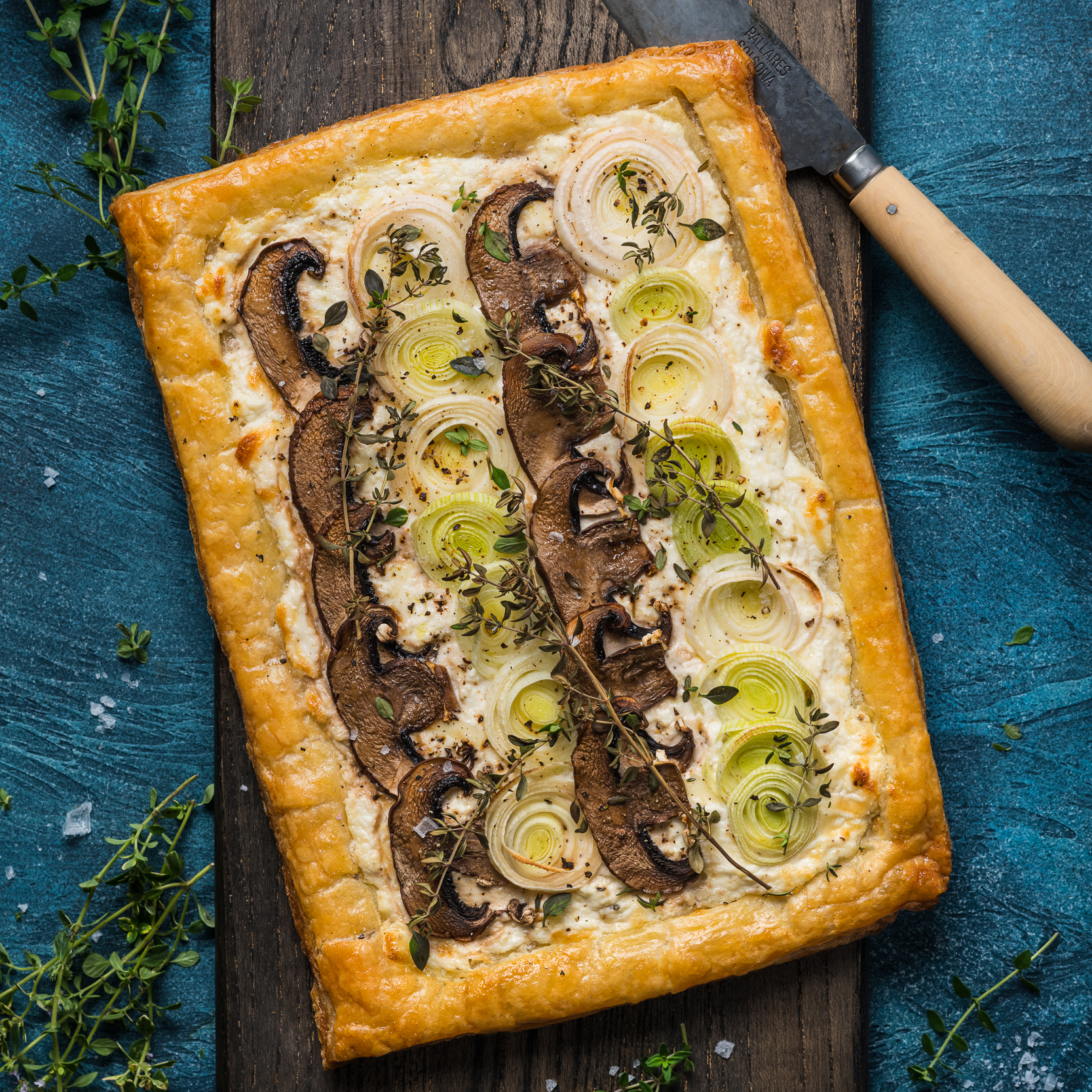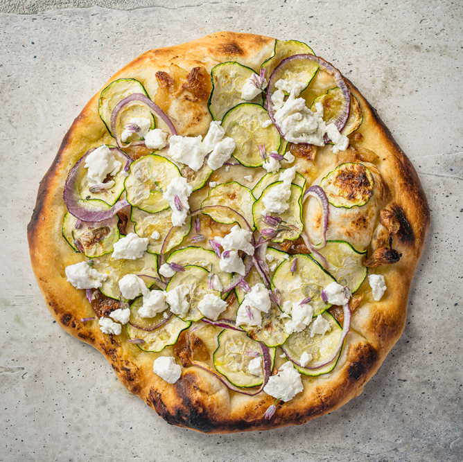 Zucchini Pizza with Garlic Confit + Goat Cheese