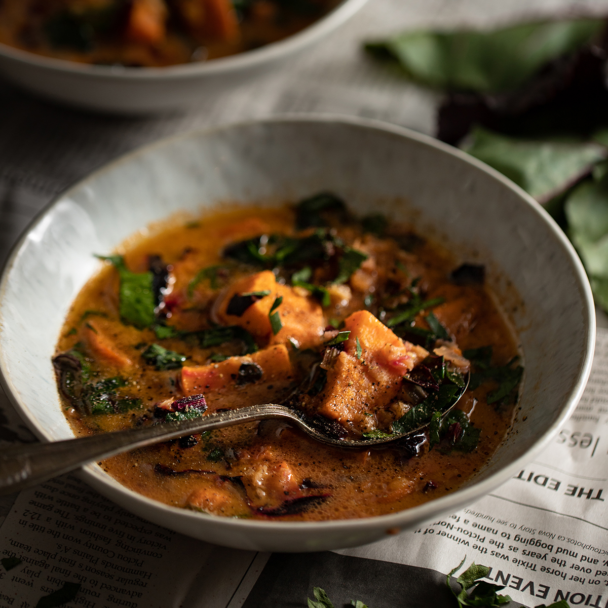 Sweet’n’ Smoky Coconut Lentil Soup with Beet Greens